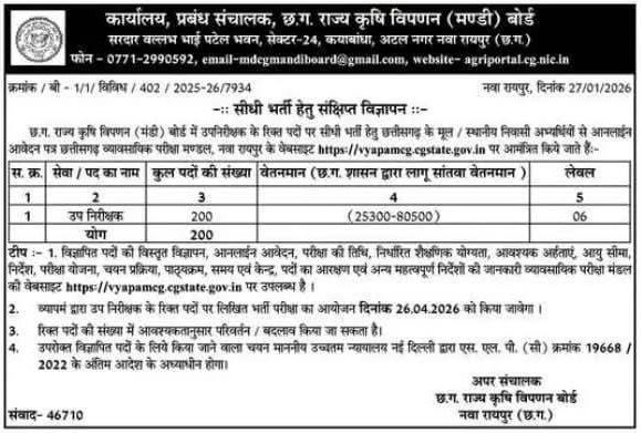 CG Vyapam द्वारा मंडी उपनिरीक्षक भर्ती परीक्षा 2026 के रिक्त पदों पर सीधी भर्ती हेतु विज्ञापन जारी किया गया है। इच्छुक अभ्यर्थी निर्धारित तिथियों के भीतर ऑनलाइन आवेदन कर सकते हैं।